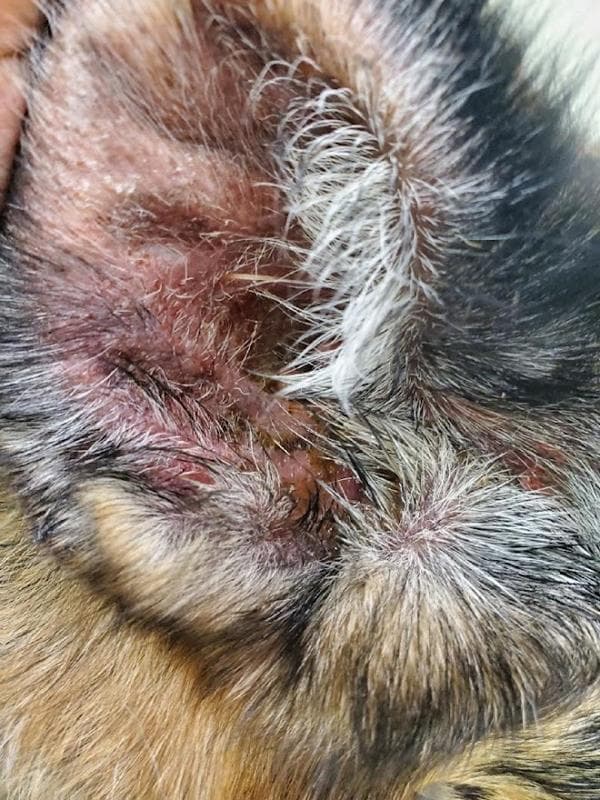 - Swollen, red ear with odor and discharge. It needs veterinarian attention.